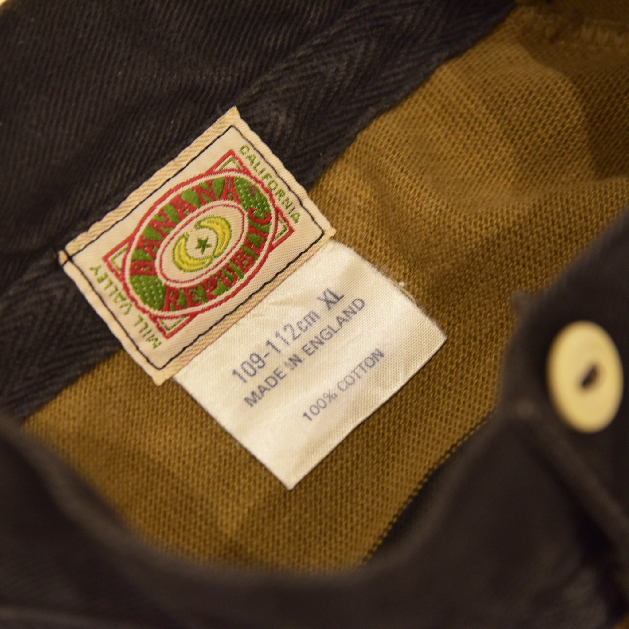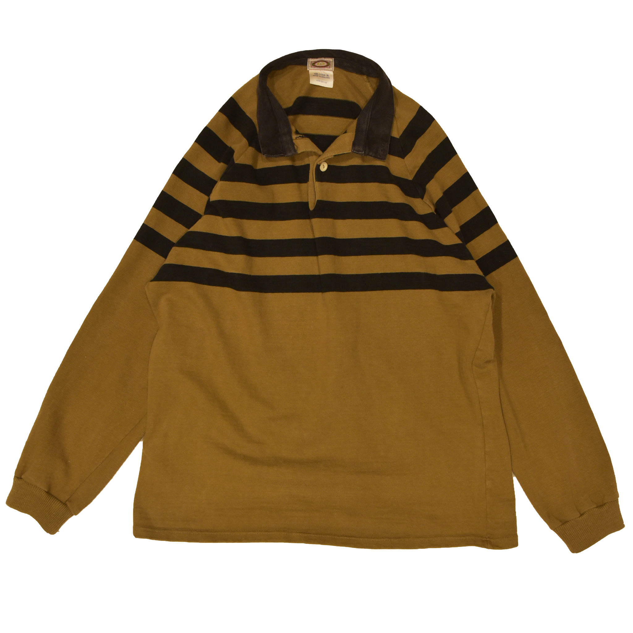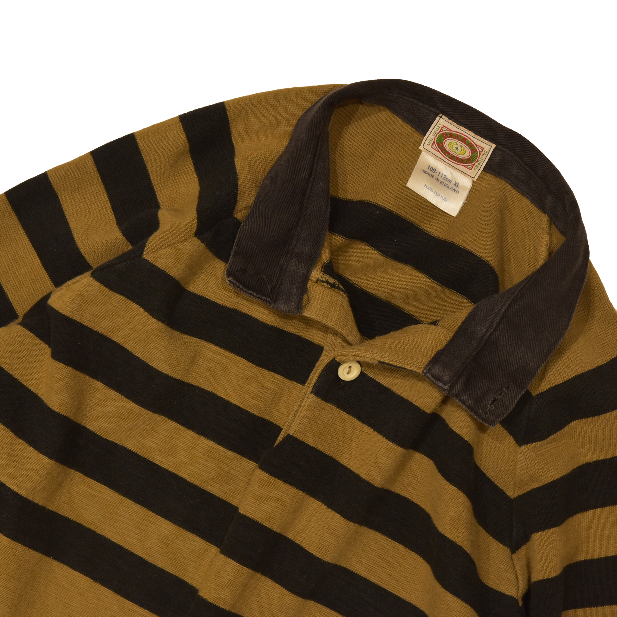 1990年代のBanana RepublicのRuggerman Sweaterです。ボディの色、上部半分だけのストライプ、そしてラグビー発祥の地イングランドMade。上品でおしゃれな1着。ヘンリーネックなのも古着らしさが出ていてツボです。